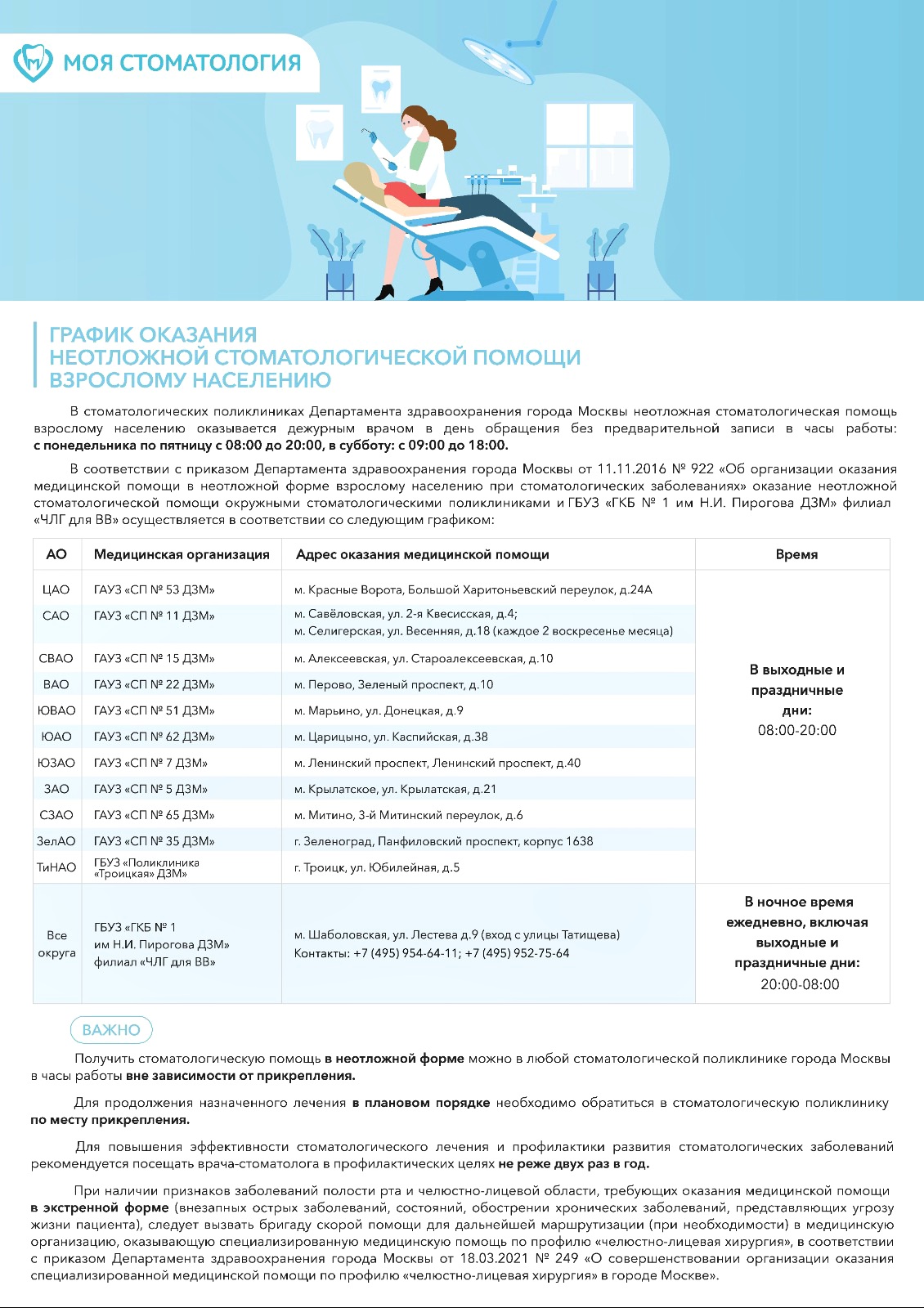 Справочная информационная линия по стоматологии Департамента здравоохранения города Москвы 8(495) 795-15-33 работает круглосуточном автоматическом режиме.